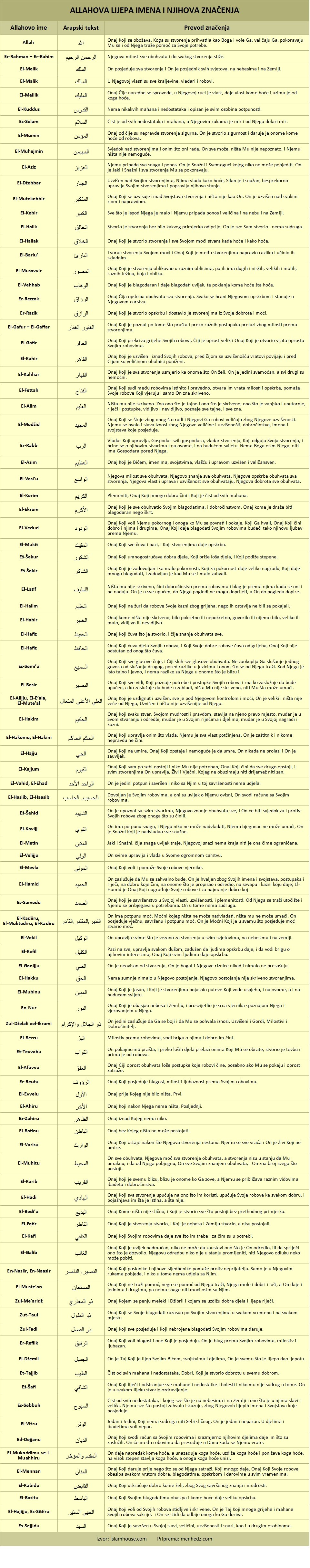 | Allahovo ime | Arapski tekst | Prevod značenja |