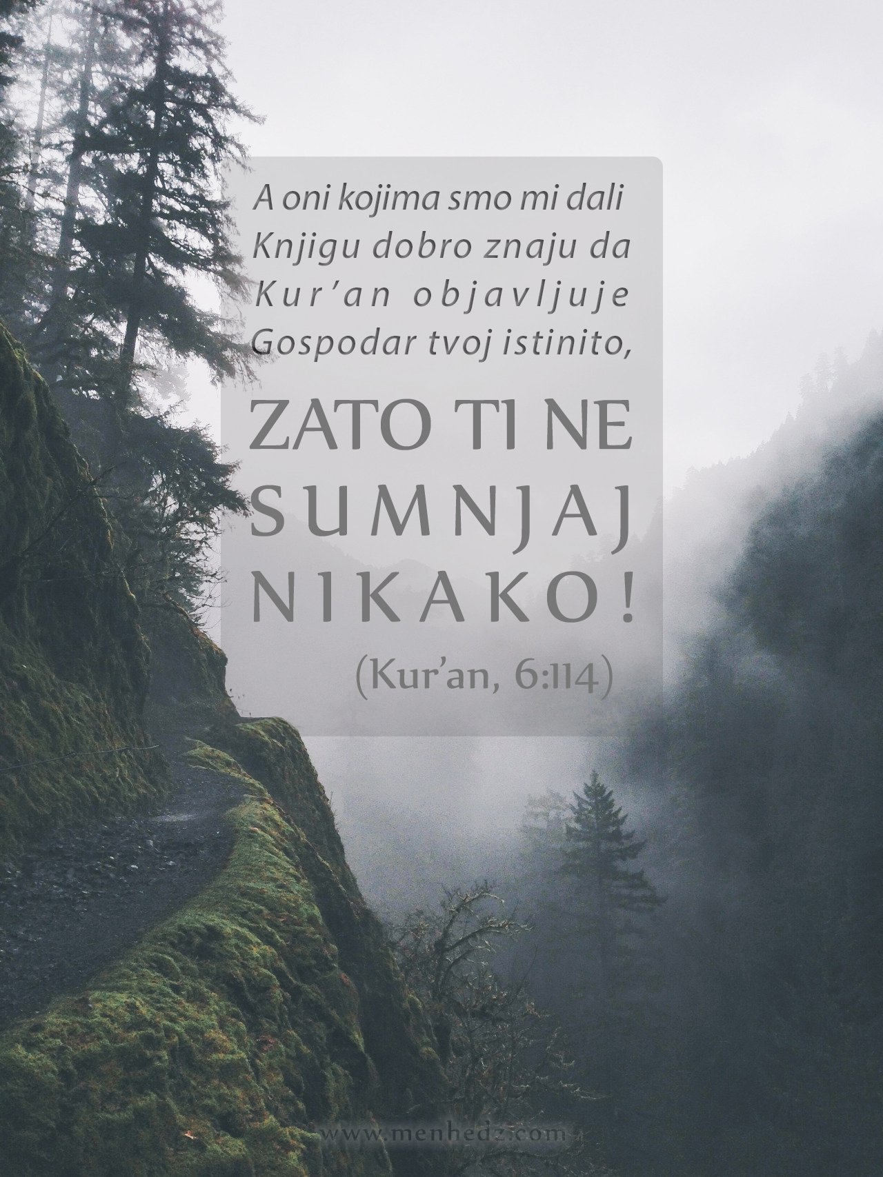Naslovnica Multimedija Foto islam - islamske slike i citati Citati iz Kur'ana: “Zato ti ne sumnjaj nikako!” MultimedijaFoto islam - islamske slike i citatiIslamPoziv u islam Citati iz Kur'ana: “Zato ti ne sumnjaj nikako!” Od - Datum uređivanja: 17. jul 2019. 4951 FacebookTelegramWhatsAppViberTwitter A oni kojima smo Mi dali Knjigu dobro znaju da Kur'an objavljuje Gospodar tvoj istinito, zato ti ne sumnjaj nikako! (Kur’an, 6:114)