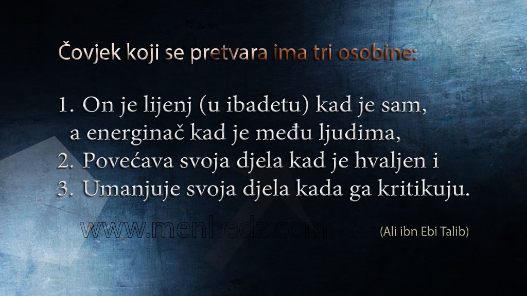 Naslovnica Multimedija Foto islam - islamske slike i citati Čovjek koji se pretvara ima ove tri osobine MultimedijaFoto islam - islamske slike i citatiIslamIskrice mudrosti Čovjek koji se pretvara ima ove tri osobine Od - Datum uređivanja: 30. dec 2018. 2795 FacebookTelegramWhatsAppViberTwitter Islamski foto citat: On je lijenj (u ibadetu) kad je sam, a energinač kad je među ljudima, Povećava svoja djela kad je hvaljen i Umanjuje svoja djela kada ga kritikuju. (Ali ibn Ebi Talib) Kliknite na sliku za veći prikaz. Priprema: Menhedz.com