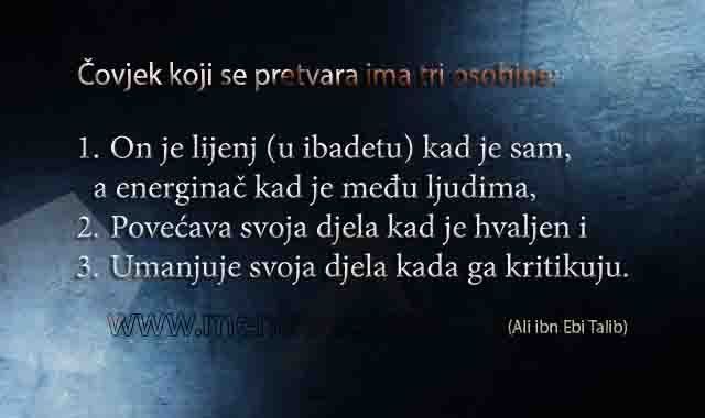 MultimedijaFoto islam - islamske slike i citatiIslamIskrice mudrosti Čovjek koji se pretvara ima ove tri osobine Od - Datum uređivanja: 30. dec 2018. FacebookTelegramWhatsAppViberTwitter Islamski foto citat: On je lijenj (u ibadetu) kad je sam, a energinač kad je među ljudima, Povećava svoja djela kad je hvaljen i Umanjuje svoja djela kada ga kritikuju. (Ali ibn Ebi Talib) Kliknite na sliku za veći prikaz. Priprema: Menhedz.com