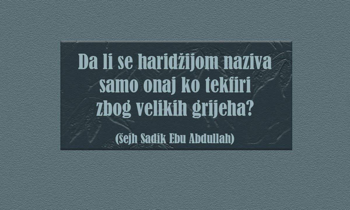 Stoga tvrdnja da je haridžija samo onaj ko tekfiri zbog velikih grijeha jeste tvrdnja koja je batil (neispravna). Iz tog razloga su učenjaci naveli da je od karakteristika haridžija da oni tekfire zbog grijeha i da smatraju grijehom ono što nije grijeh, da kad kad protekfire i zbog dozvoljenih stvari a možda i zbog neke pokornosti misleći da je to grijeh (poput postupka haridžija za vrijeme Alije i Muavije kada su protekfirili ove ashabe zbog, ne samo dozvoljene, već poželjne stvari, a to je uzimanje dva sudca koji će popraviti stanje među njima. Te su haridžije tada podigle svoj poznati slogan: „Sud pripada samo Allahu.“ Tako da je njihov tekfir u ovom slučaju bio tekfir zbog dozvoljene i poželjne stvari koju su haridžije smatrali kufrom, op. prev.)