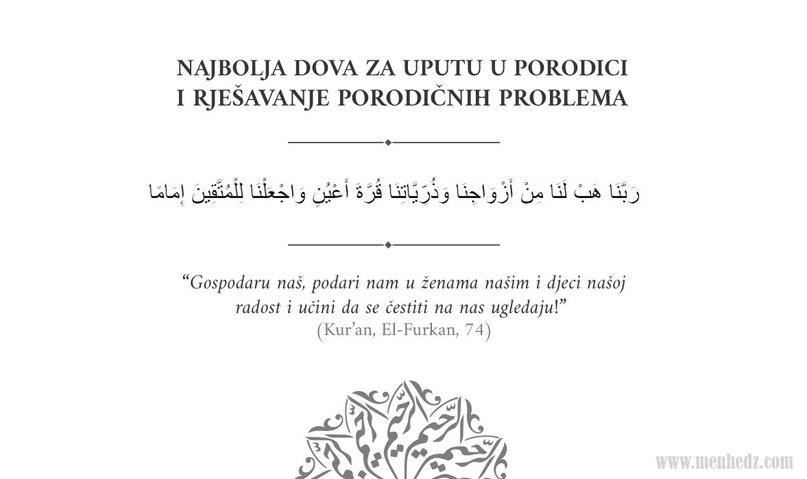 Jedna od najupečatljivijih i najboljih dova kojom se od Allaha traži dobro za nas i naše porodice, te za rješavanje porodičnih problema, jeste kur'anska dova koja se spominje u suri Furkan, a koja glasi: