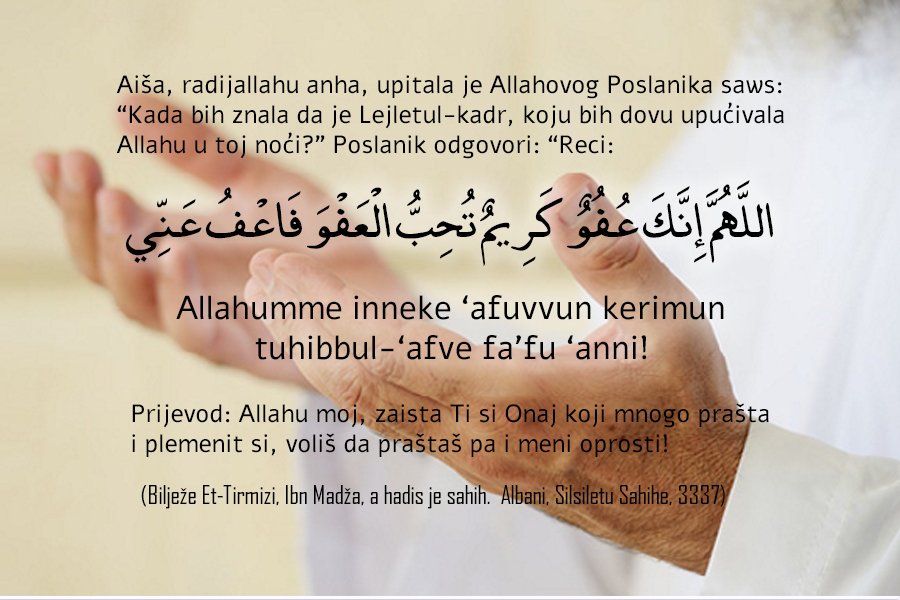 “Reci: Allahu moj, zaista Ti si Onaj koji mnogo prašta i plemenit si, voliš da praštaš pa i meni oprosti!.”