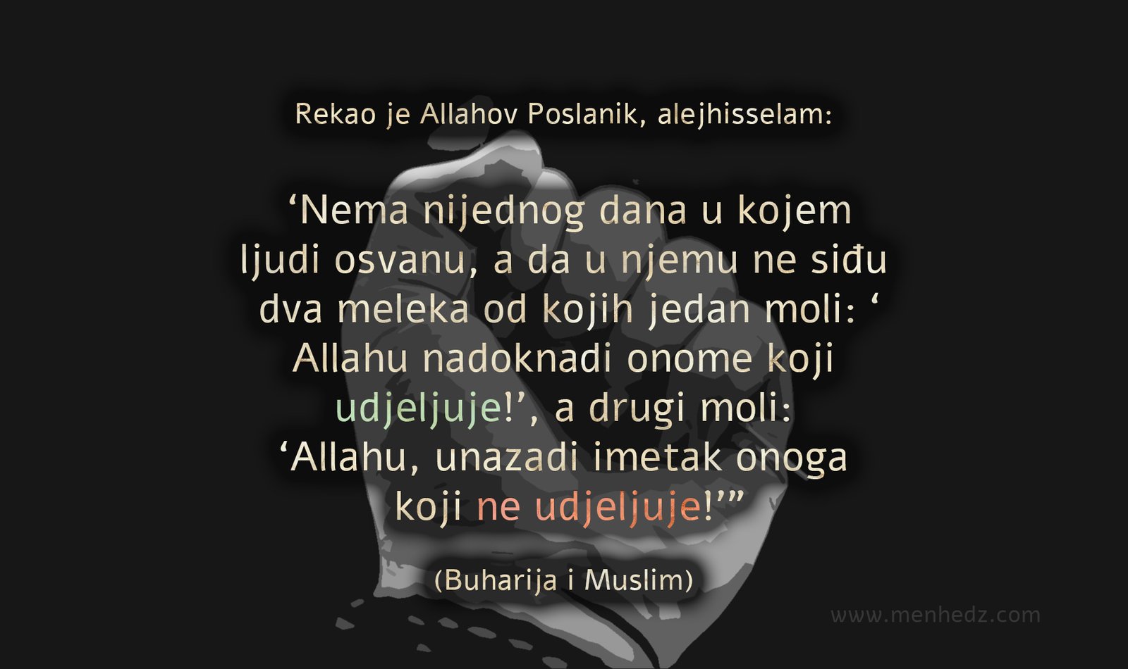 “Allahov Poslanik, sallallahu alejhi ve sellem, rekao je: ‘Nema nijednog dana u kojem ljudi osvanu, a da u njemu ne siđu dva meleka od kojih jedan moli: ‘Allahu nadoknadi onome koji udjeljuje!’, a drugi moli: ‘Allahu, unazadi imetak onoga koji ne udjeljuje!'”