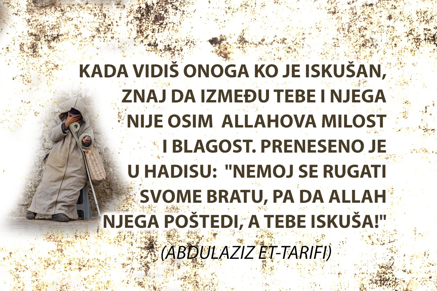 Kada vidiš onoga ko je iskušan, znaj da između tebe i njega nema osim Allahova milost i blagost. Preneseno je u hadisu: “Nemoj se rugati svome bratu, pa da Allah njega poštedi, a tebe iskuša!” (šejh Abdul-Aziz et-Ta'rifi)