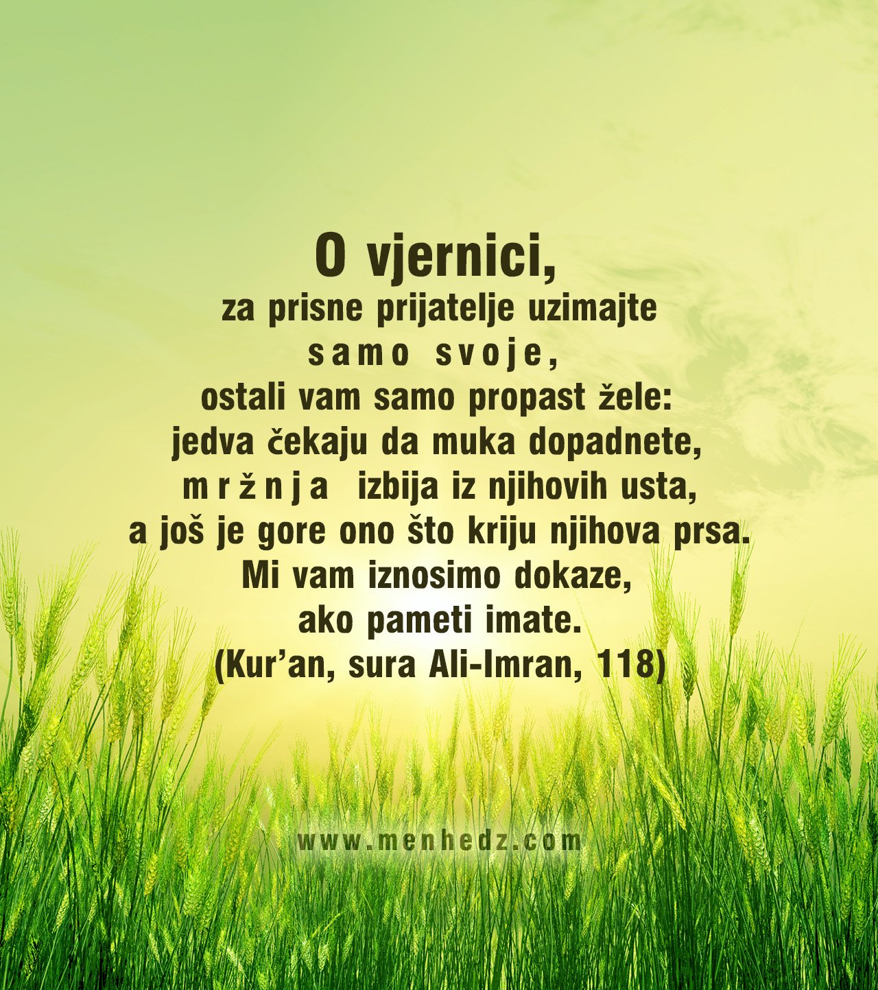 O vjernici, za prisne prijatelje uzimajte samo svoje, ostali vam samo propast žele: jedva čekaju da muka dopadnete, mržnja izbija iz njihovih usta, a još je gore ono što kriju njihova prsa. Mi vam iznosimo dokaze, ako pameti imate. (Kur'an, sura Ali Imran, ajet 118)
