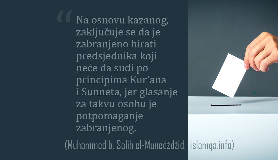 MultimedijaFoto islam - islamske slike i citati Foto citat: Zabranjeno je birati predsjednika koji neće da sudi po principima Kur'ana i Sunneta Od - Datum uređivanja: 07. sep 2019. FacebookTelegramWhatsAppViberTwitter Na osnovu kazanog, zaključuje se da je zabranjeno birati predsjednika koji neće da sudi po principima Kur'ana i Sunneta, jer glasanje za takvu osobu je potpomaganje zabranjenog. (Muhammed b. Salih el-Munedždžid, www.islamqa.info, www.islamhouse.com)