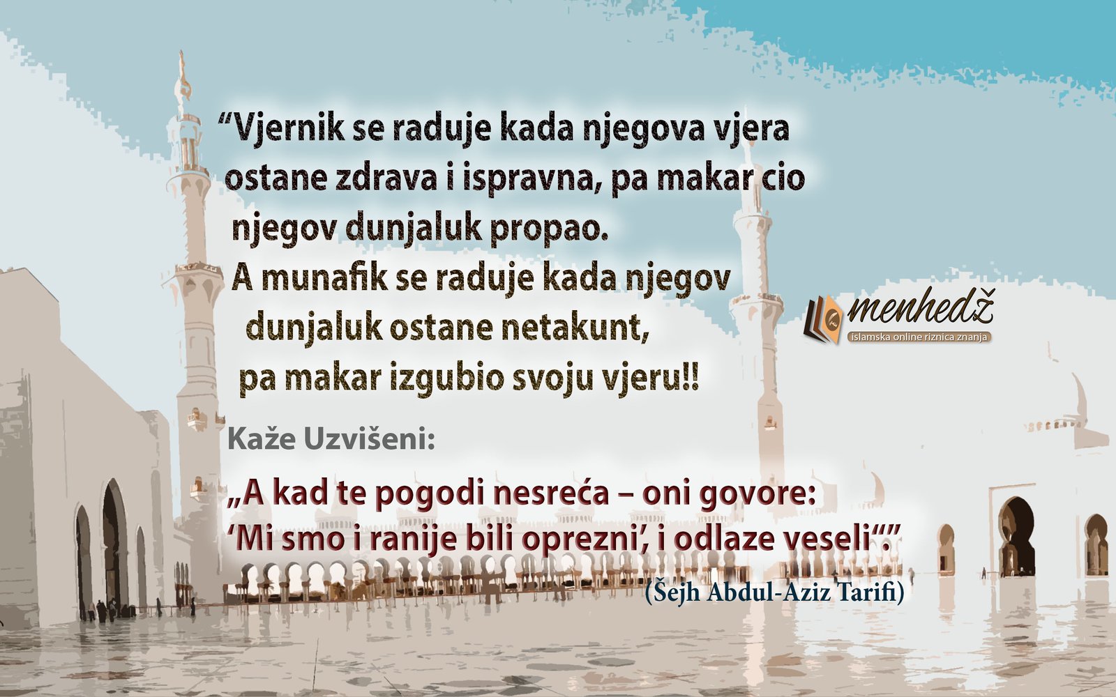 Vjernik se raduje kada njegova vjera ostane zdrava i ispravna, pa makar cio njegov dunjaluk propao. A munafik se raduje kada njegov dunjaluk ostane netaknut, pa makar izgubio svoju vjeru! Kaže Uzvišeni: „A kad te pogodi nesreća – oni govore: „Mi smo i ranije bili oprezni“, i odlaze veseli“.