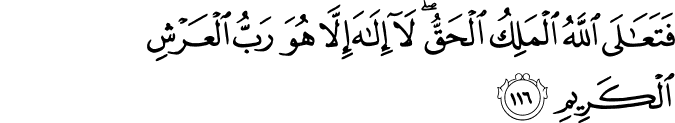 Prijevod: “Zar ste mislili da smo vas uzalud stvorili i da Nam se nećete povratiti?” I neka je uzvišen Allah, Vladar istiniti, nema drugog boga osim Njega, Gospodara svemira veličanstvenog! A onaj koji se, pored Allaha, moli drugom bogu, bez ikakva dokaza o njemu, pred Gospodarom svojim će račun polagati, i nevjernici ono što žele neće postići. I reci: “Gospodaru moj, oprosti i smiluj se, Ti si najmilostiviji!” (El-Mu'minun, 115- 118)