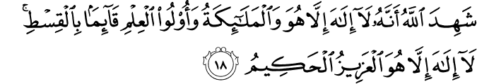 Transliteracija: Šehidellaahu ennehuu laa ilaahe illaa huve ve-l-melaa'iketu ve ulu-l-‘ilmi qaa'imen bi-l-qisti laa ilaahe illaa huve-l-‘aziizu- l-hakiim. Inned-diine ‘indellaahi-l-islaam, ve mahtelefel-leziine uutu- l-kitaabe illaa min ba'di maa džaaehumu-l-‘ilmu bagjen bejnehum, ve mej-jekfur bi aajaatillaahi fe innellaahe serii'u-l- hisaab. (Ali ‘Imran, 18-19)