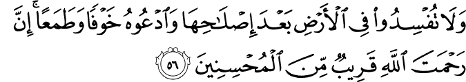 Transliteracija: Inne rabbekumul-laahul-lezii haleqas-semaavaati ve-l-erda fii sitteti ejjaamin summe-stevaa ‘ale-l-‘arši jugšil-lejlennehaare jatlubuhuu hasiisen veš-šemse ve-l-qamere vennudžuume musehharaatin bi emrihii elaa lehu-l-halqu ve-l- emru tebaarekel-laahu rabbu-l-‘aalemiin. Ud'uu rabbekum tedarru'an ve hufjeh, innehuu laa juhibbu-l-mu'tediin. Ve laa tufsiduu fi-l-erdi ba'de islaahihaa ved'uuhu havfen ve tame'aa, inne rahmetellaahi qariibun mine-l-muhsiniin. (El-‘A'raf, 54-56)