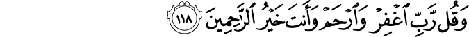 Transliteracija: Efehasibtum ennemaa halaqnaakum ‘abesen ve ennekum ilejnaa laa turdže'uun. Fe te'aalel-laahu-l-meliku-l-haqqu laa ilaahe illaa huve rabbu-l-‘arši-l-keriim. Ve mej-jed'u me'allaahi ilaahen aahare laa burhaane lehuu bihii fe innemaa hisaabuhuu ‘inde rabbih, innehuu laa juflihu-l-kaafiruun. Ve qur-rabigfir verham ve ente hajrur-raahimiin. (El-Mu'minun, 115- 118)