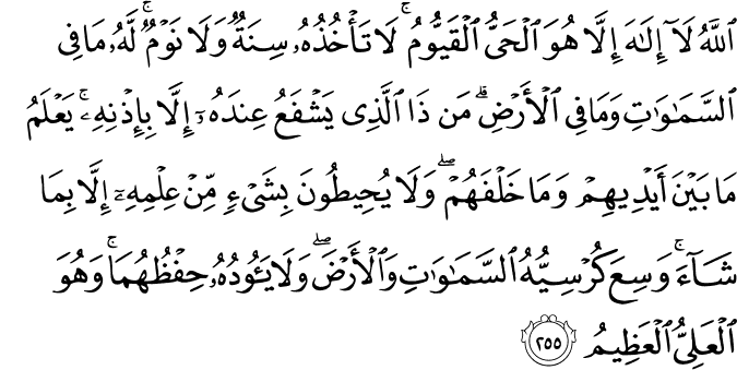 Transliteracija: Allaahu laa ilaahe illaa huve-l-hajju-l-qajjuum. Laa te'huzuhuu sinetun ve la nevm. Lehu maa fis-semaavaati ve maa fi-l-erd. Men zellezii ješfe'u ‘indehuu illaa bi iznih. Ja'lemu maa bejne ejdiihim ve maa halfehum ve laa juhiituune bi šej'in min ‘ilmihii illa bimaa šaa'e vesi'a kursijjuhus-semaavaati ve- l-erda ve laa je'uuduhuu hifzuhumaa ve huve-l-‘alijju-l-‘aziim. Laa ikraahe fid-diini qad tebejjener-rušdu mine-l-gajji fe men jekfur bit-taaguuti ve ju'min billaahi faqdistemseke bi-l- ‘urveti-l-vusqaa. Lenfisaame lehaa. Vallaahu semii'un ‘aliim. Allaahu velijjulleziine aamenuu, juhridžuhum minezzulumaati ilen-nuur. Velleziine keferuu evlijaauhumuttaaguutu juhridžuunehum minen-nuuri ilez-zulumaat. Ula'ike ashaabun-naari hum fiihaa haaliduun. (El-Beqare, 255-257)