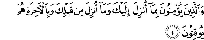 Prijevod: Elif Lām Mīm. Ova Knjiga, u koju nema nikakve sumnje, uputstvo je svima onima koji se budu Allaha bojali; onima koji u nevidljivi svijet budu vjerovali i molitvu obavljali i udjeljivali dio od onoga što im Mi budemo davali; i onima koji budu vjerovali u ono što se objavljuje tebi i u ono što je objavljeno prije tebe, i onima koji u onaj svijet budu čvrsto vjerovali. Njima će Gospodar njihov na Pravi put ukazati i oni će ono što žele ostvariti. (El-Bekare, 1-5)