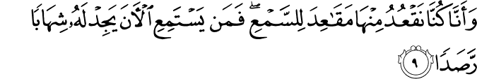 Transliteracija: Qul uuhije ilejje ennehu-steme'a neferun mine-l-džinni fe qaaluu innaa semi'naa qur'aanen ‘adžebaa, jehdii iler-rušdi fe aamennaa bih, ve len nušrike bi rabbinaa ehadaa, ve ennehu te'aalaa džeddu rabbinaa mettehaze saahibeten ve la veledaa, ve ennnehuu kaane jequulu sefiihunaa ‘alellaahi šetataa, ve ennaa zanennaa en len tequule-l-insu ve-l-džinnu ‘alellaahi kezibaa, ve ennehuu kaane ridžaalun mine-l-insi je'uuzuune bi ridžaalin mine-l-džinni fe zaaduuhum reheqaa, ve ennehum zannu kemaa zanentum en len jeb'asellaahu ehadaa, ve ennaa lemesnessemaa'e fe vedžednaahaa muli-et haresen šediiden ve šuhubaa, ve ennaa kunnaa naq'udu minhaa meqa'ide lissem'i fe men jestemi'i-l-aane jedžid lehuu šihaaben resadaa, Ye ennaa laa nedrii ešerrun uriide bi men fi-l-erdi em eraade bihim rabbuhum rešedaa, ve ennaa minnes-saalihuune ve minnaa duune zalik, kunnaa taraa'iqa qidedaa, ve ennaa zanennaa en len nu'džizellaahe fi-l-erdi… (El-Džinn, 1–12)