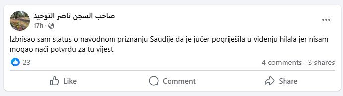 Ova vijest i dalje kruži među sljedbenicima pomenutog stava, iako ju je Nedžad Balkan obrisao sa svog profila.