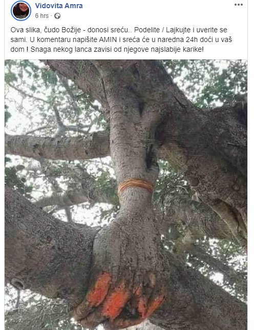 Naime, sihirbazica i vračara, varalica i šejtanov sluga, izvjesna “vidovita” Amra, na svojoj Facebook stranici objavila je danas fotografiju drveta uz komentar:
